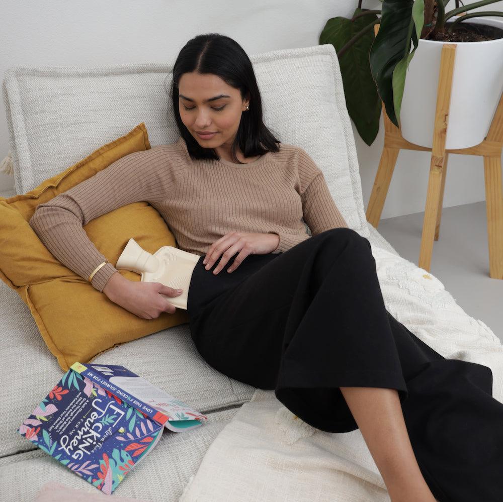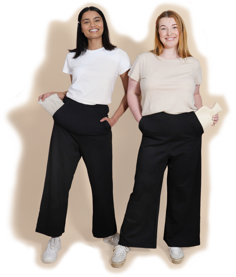Stylish everyday pants with a discrete hot water bottle pouch